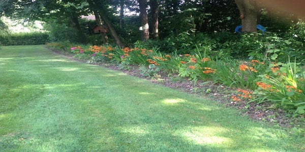 Afgesloten Privé parking, en in de stralende zon deze prachtige B&B mooie bebloemde, wilde tuin met bos op 1 ha met terras en een super grote koi vijver met eiland .