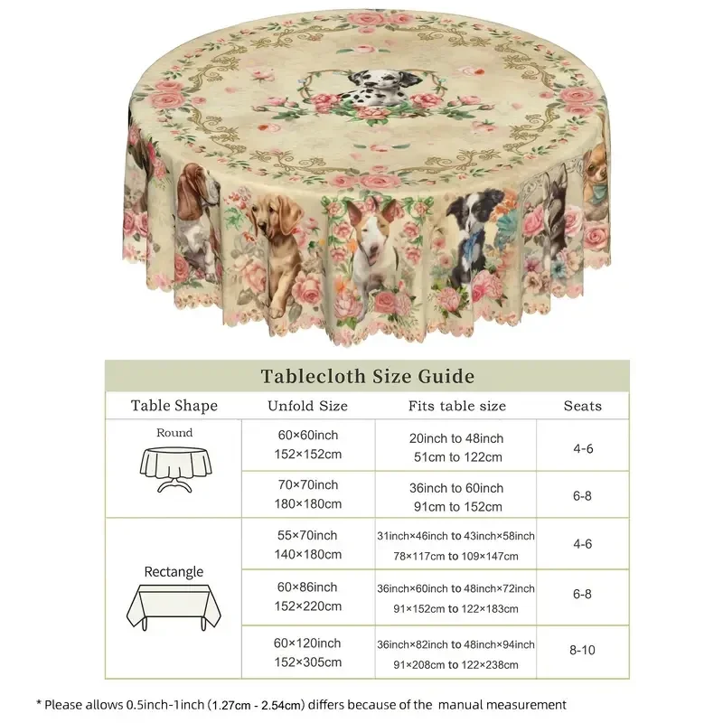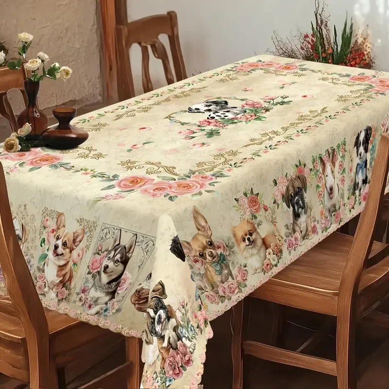 Ronde Polyesteren Tafelkleed met Hondenpatroon, 100% Geweven Stof, Geëmbosseerde Randen, Lente Bloemmotief, Duurzame Decoratie voor Huis & Buiten,