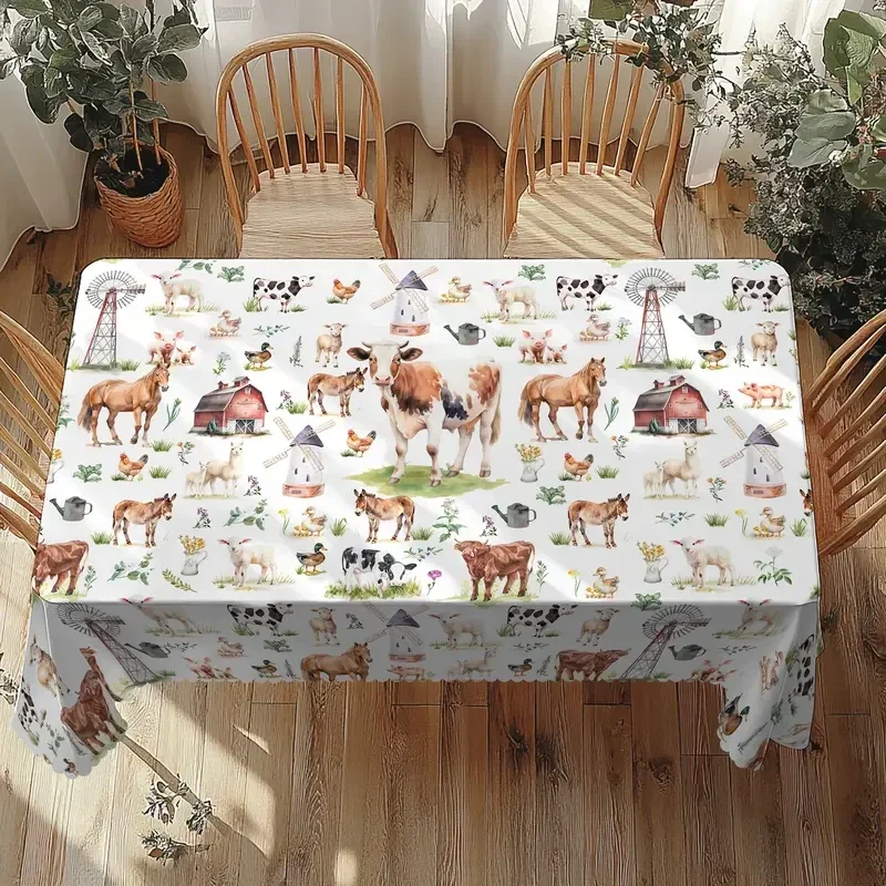 Boerderij-Themed Animal Print Tafelkleed - Polyester, Ronde & Rechthoekse Vormen, Geëmailleerde Rand, Bevat Koeien, Paarden, Geiten, Eenden, Windmolen & Schuur