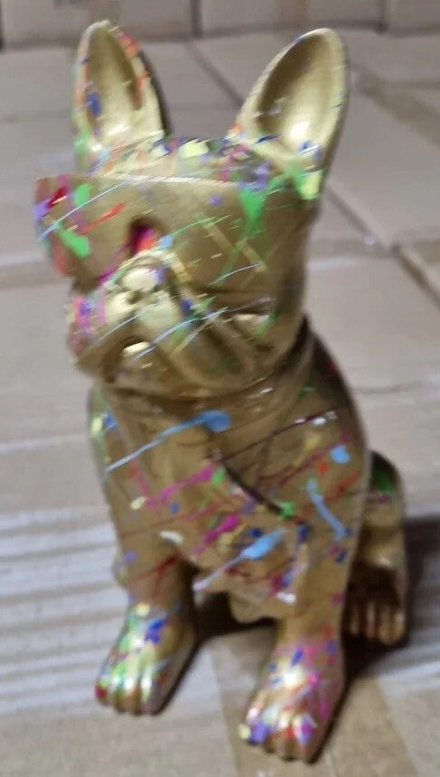 Statue sculpture   Chien bouledogue de France avec lunettes et cravate multicolore 37 cm