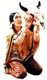 In038A Curiosa indiaan geknield met schedel in handen polyester résine 80 cm